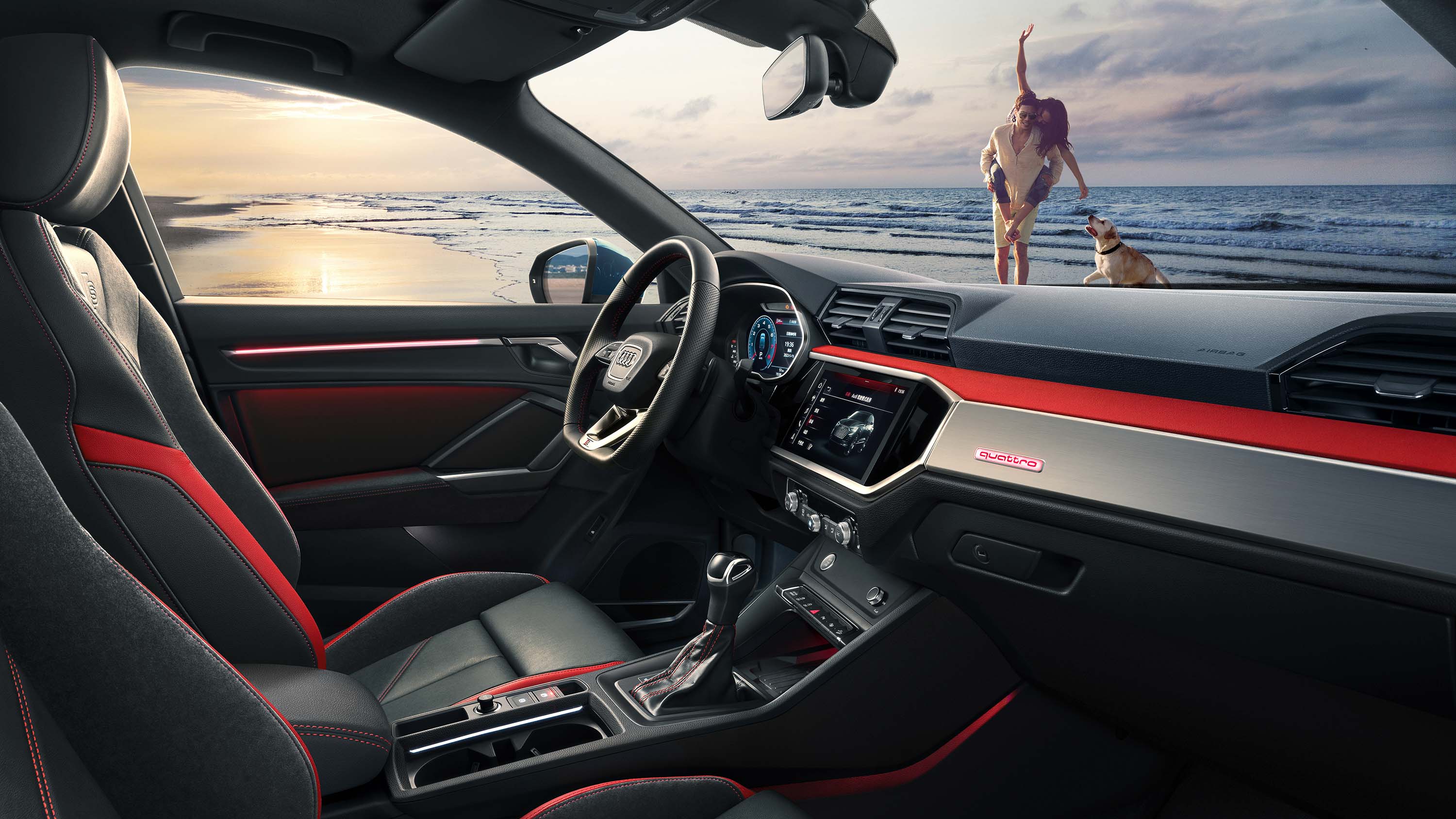 2023款奥迪Q3家族仪表与中控台呈双层横向设计,上层是空调出风口,下层则是带有黑色面板的控制区域,环抱一体式设计增加了车内的视觉宽度,能够为驾乘者带来宽敞、惬意的体验。中控台的八边形造型与外观前脸的一体式格栅设计相呼应,并向驾驶席方向倾斜10度,便于驾驶者操作。同时,2023款奥迪Q3轿跑45TFSI车型座椅面料升级为带微打孔的真皮与阿尔卡塔纳组合,显著提升车内豪华质感。