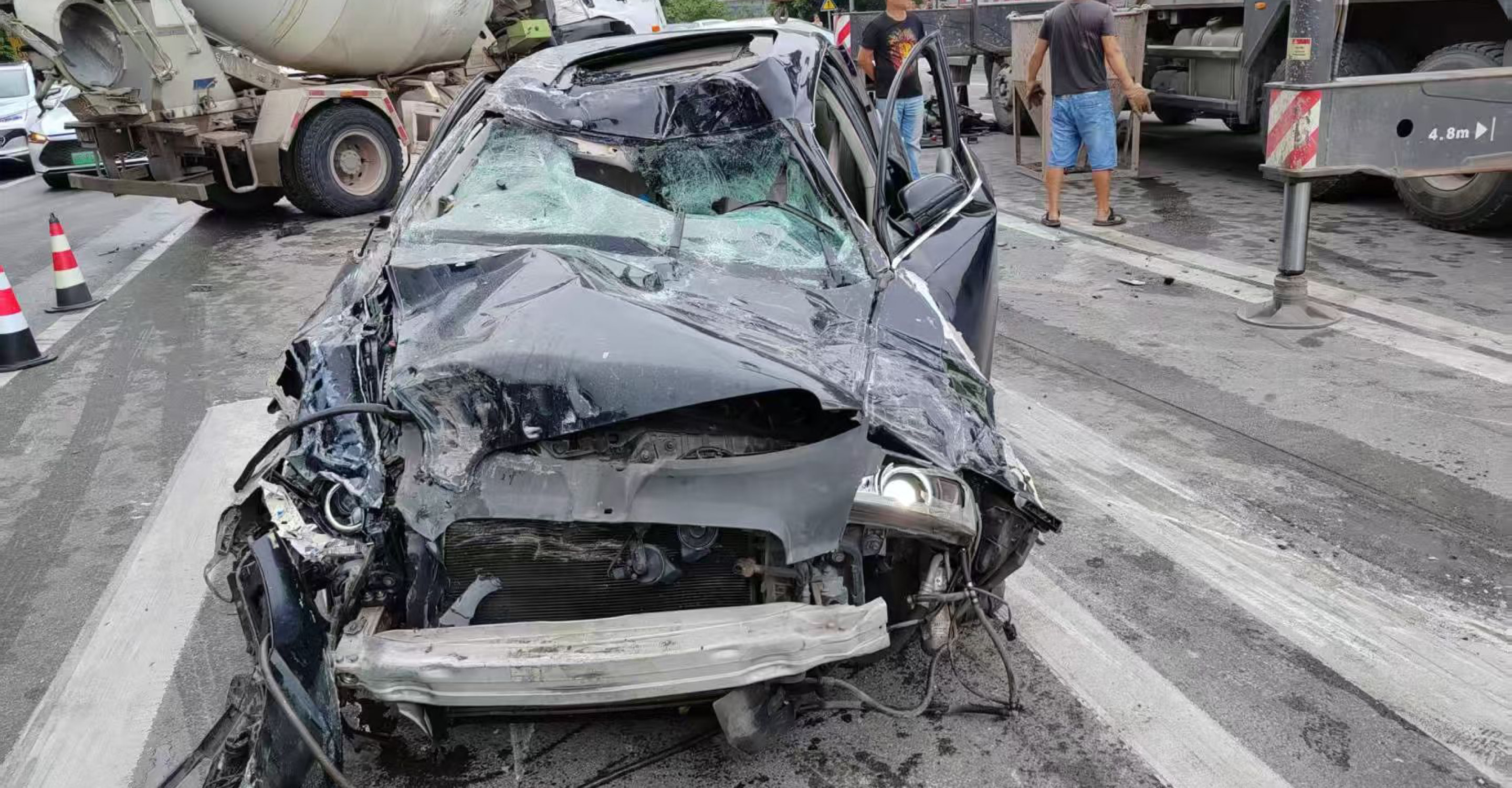 9月26日四川自贡严重交通事故现场,一辆水泥罐车突然侧倾压向路口等待红灯的星空电竞官网 A6L