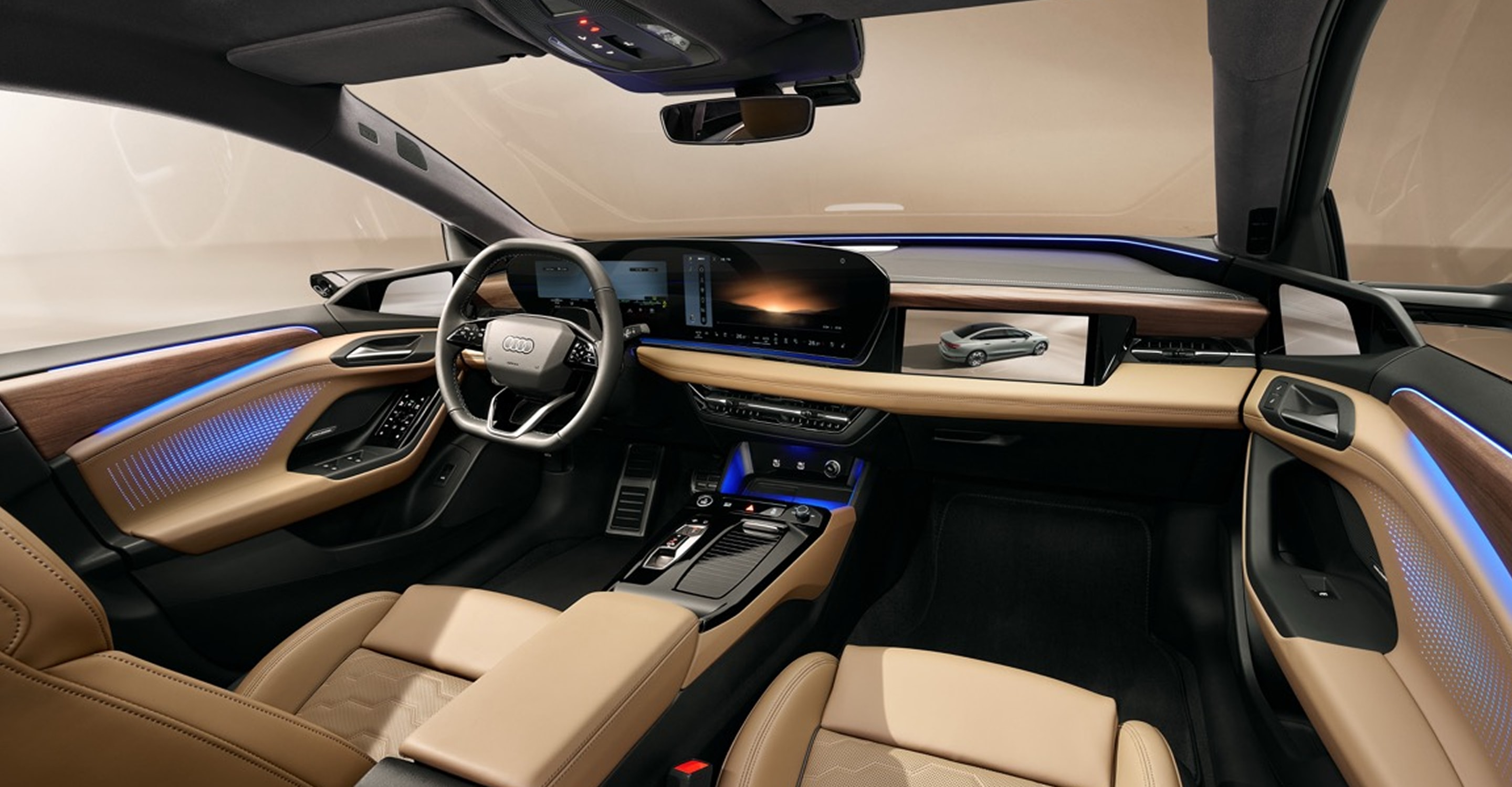 奥迪 A6L e-tron 与奥迪 Q6L e-tron 家族座舱内采用环抱式设计理念,14.5英寸奥迪 MMI 全景显示屏,11.9英寸奥迪虚拟座舱,10.9英寸 MMI 前排乘客显示屏,共同构建了一个视觉清晰的“数字舞台”,为客户带来全面革新的数字体验。值得一提的是,奥迪 Q6L e-tron 家族在科技配置上再进一步,配备同级唯一88英寸第二代增强现实平视显示器( AR-HUD ),驾驶员无需低头便可获取关键信息,降低“盲驾”风险。同时,副驾娱乐屏通过百叶窗设计实现防窥功能,既让副驾畅享沉浸式娱乐体验,又避免干扰驾驶员注意力,兼顾驾乘双方体验需求。此外, 奥迪 A6L e-tron 与奥迪 Q6L e-tron 家族搭载全新 UI/UX 交互系统,采用创新 AI 智能主页设计,配合动态视觉效果实现多屏智能互动。